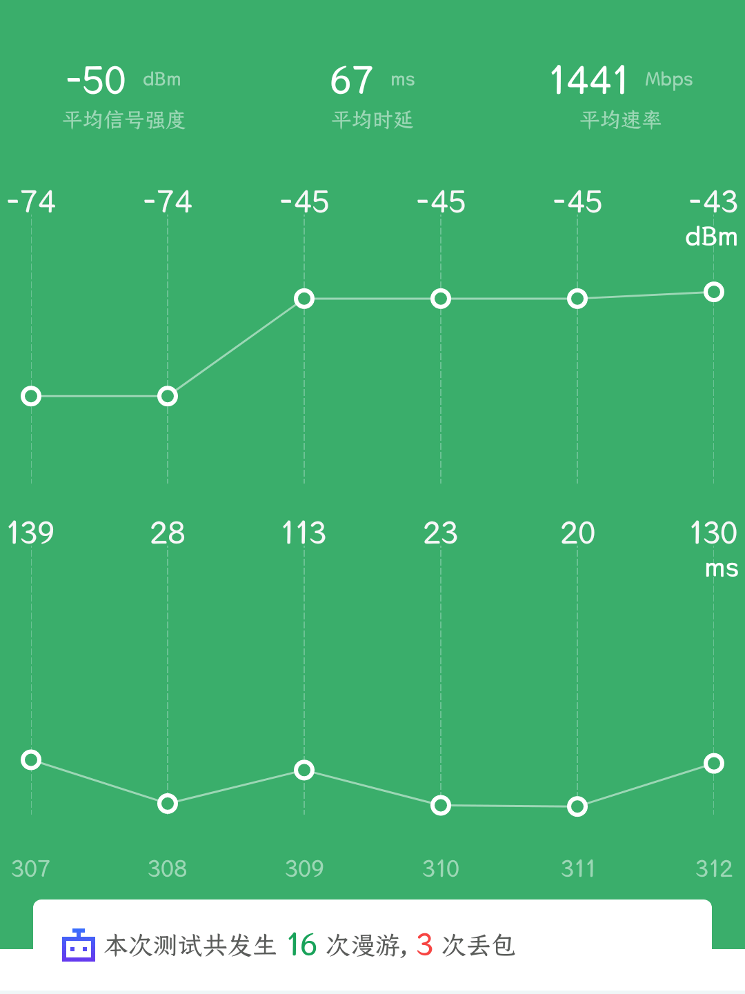 然后就是漫游了,先说结果,从AX3漫游到BE 3 PRO(主、副)有概率丢一个包(一部主力机 华为 P60 「图1」和备用机 荣耀 50「图2」),原因未知,等下周稳定后我再复测一次,看看是不是还这样,是的话就找高级工程师了😭